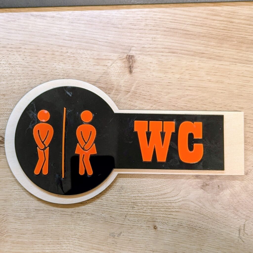 - Die Umsetzung: Das schwarze Acryl bildet den Rahmen und den Hintergrund, während die orangen Einleger für die Figuren und den Schriftzug „WC“ per Laserschnitt exakt eingepasst wurden (Inlay-Technik).