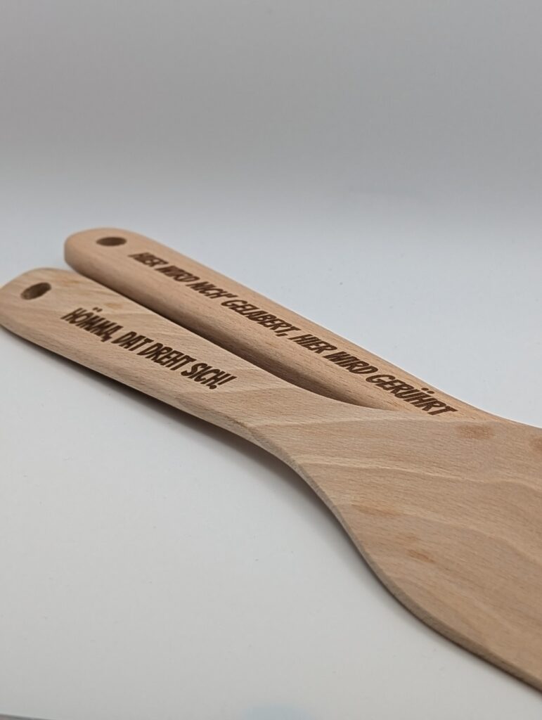 Sprüche wie „Hömma, dat dreht sich!“ oder „Hier wird nich‘ gelabert, hier wird gerührt“ sind das perfekte kleine Mitbringsel oder einfach ein Grinsen-Garant beim nächsten Nudelkochen. Hier habe ich mit ordentlich Power graviert, damit der Text tief und dunkel im Buchenholz sitzt – das hält dann auch die ein oder andere Spülrunde (per Hand natürlich!) aus.