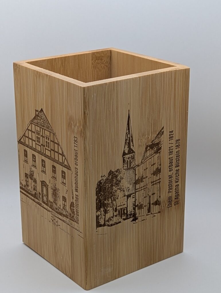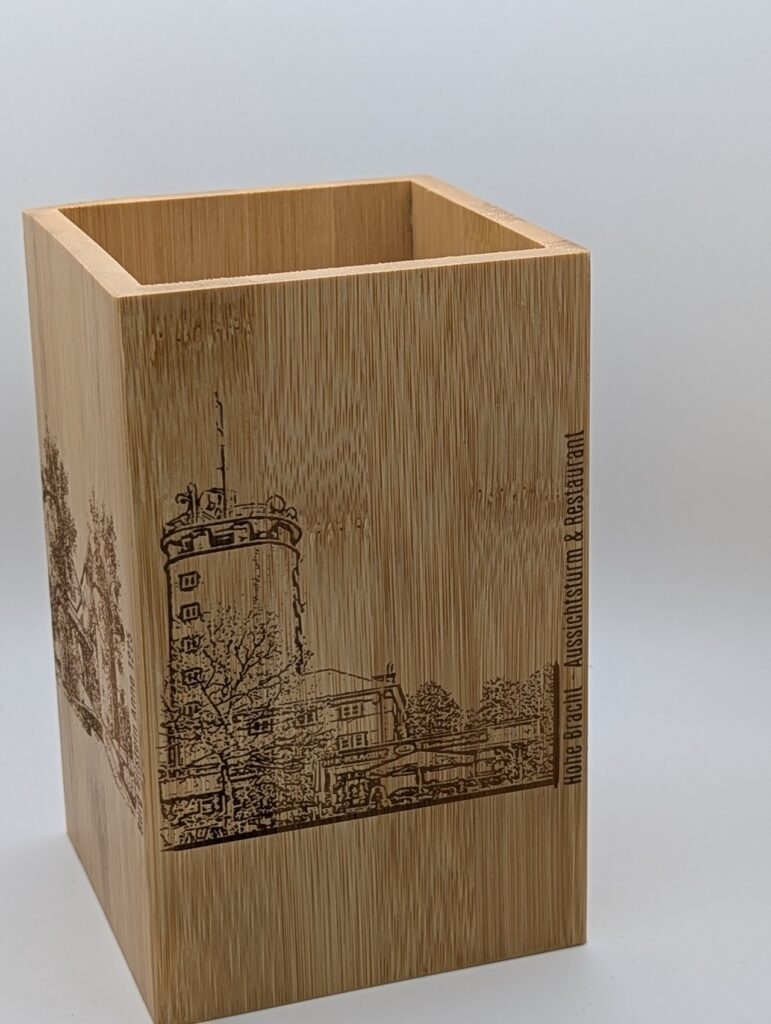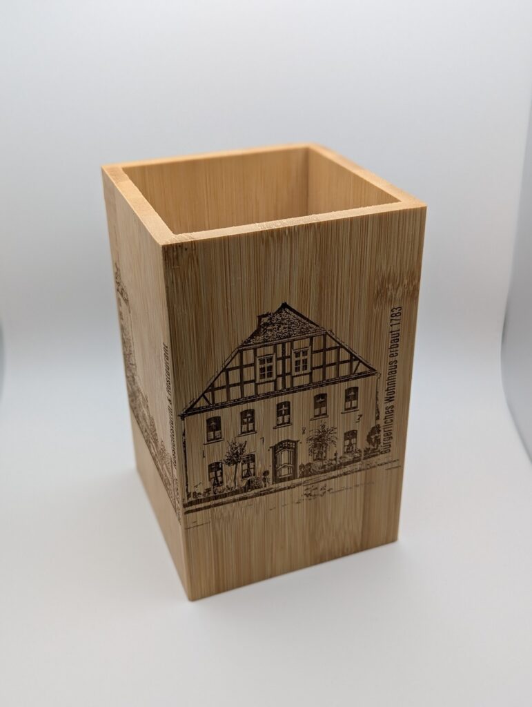 Ich wollte schon lange etwas Bleibendes mit Motiven aus unserer Region machen. Die Wahl fiel auf einen schlichten Stifteköcher aus Bambus. Bambus ist ein dankbares, aber auch eigenwilliges Material – die Maserung gibt der Gravur oft einen ganz eigenen, fast antiken Look.