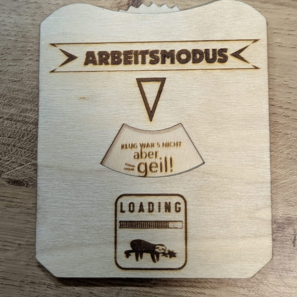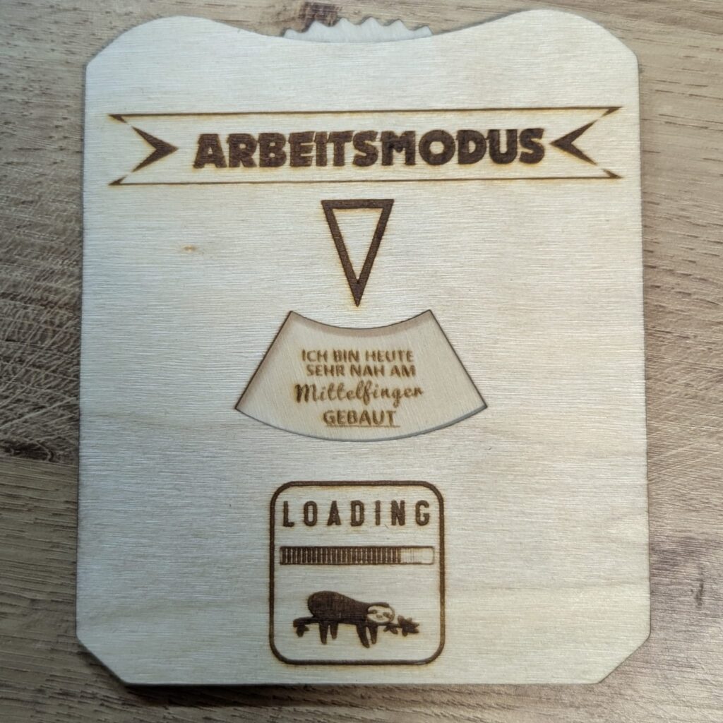Hand aufs Herz: Seid ihr heute auch „sehr nah am Mittelfinger gebaut“? Wir alle haben diese Tage, an denen die Motivation im Schneckentempo – oder eher im Faultiertempo – lädt. Genau für diese Momente habe ich mein neuestes Laser-Projekt umgesetzt: Eine interaktive Status-Anzeige für den Schreibtisch.