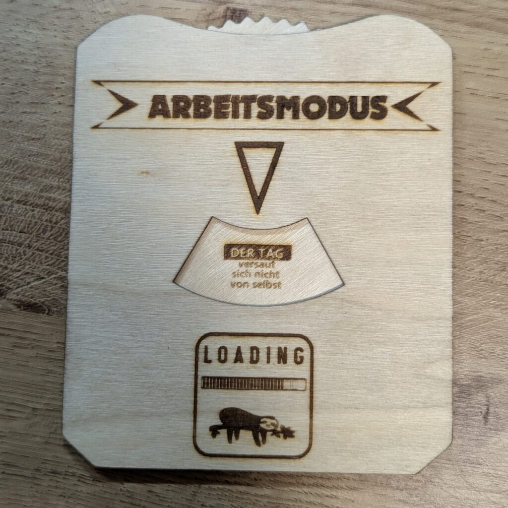 Das Foto zeigt ein quadratisches Werkstück aus hellem Naturholz mit abgerundeten Ecken. Im oberen Drittel ist ein Banner mit der Aufschrift „ARBEITSMODUS“ eingraviert, auf den ein kleiner Pfeil zeigt. Das Zentrum bildet ein bogenförmiges Sichtfenster, in dem durch Drehen verschiedene humorvolle Sprüche erscheinen. Im unteren Bereich sieht man ein liebevoll graviertes Gehäuse mit der Aufschrift „LOADING“, einem Fortschrittsbalken und einem detailreichen Faultier, das an einem Blatt kaut. Das Holz weist eine sanfte Maserung auf, und die Gravuren sind in einem satten, dunklen Braunton gehalten, was dem Ganzen eine hochwertige, rustikale Optik verleiht.