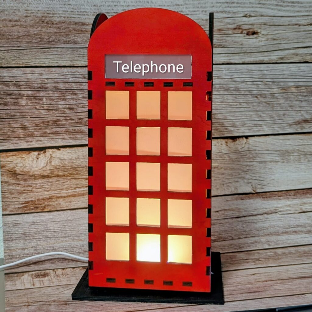 Ein Foto, das den fertiggestellten DIY-Lichtkasten zeigt. Er ist in der Form einer roten britischen Telefonzelle gestaltet und aus lasergeschnittenem Sperrholz gefertigt. Der Lichtkasten ist mit der Airbrush rot lackiert und durch die Fenster fällt ein warmes, gemütliches Licht.